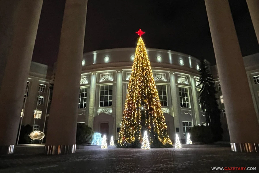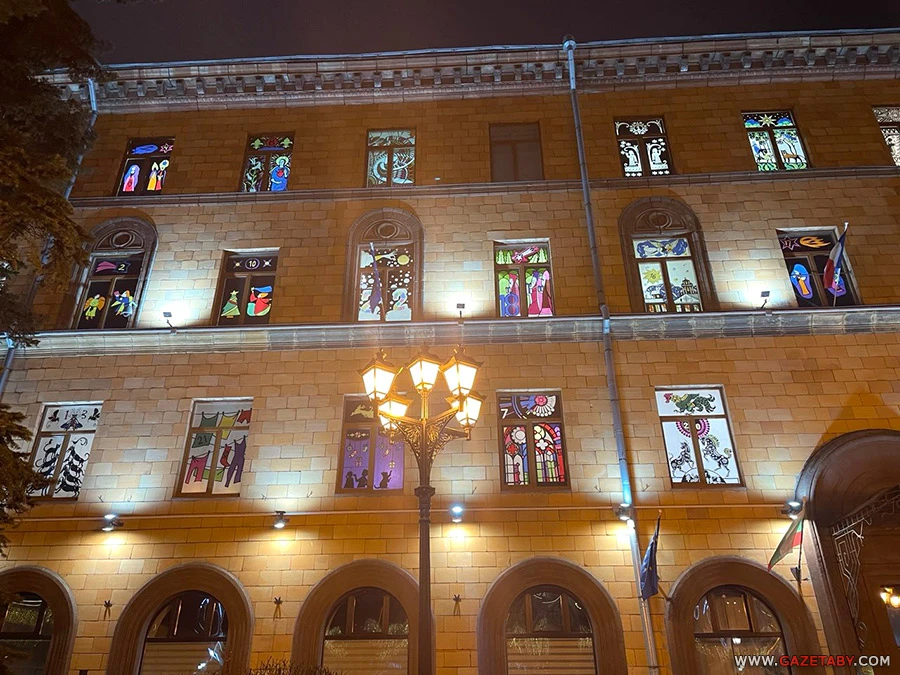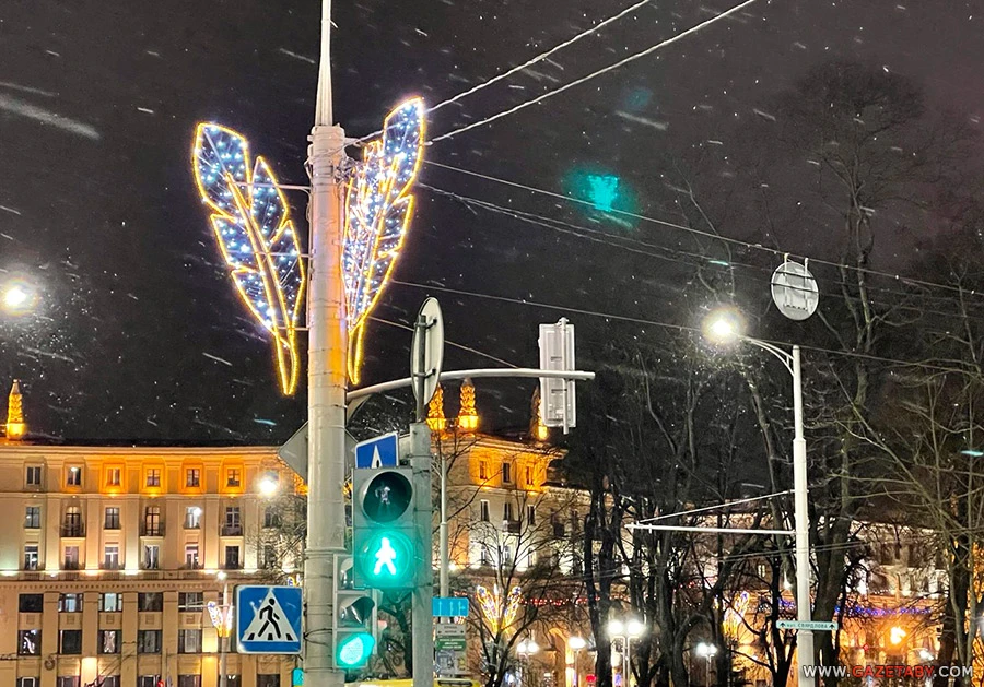 Бліскучы снежны Мінск плюс амаль усе адчыненыя акенцы з малюнкамі на плошчы Свабоды