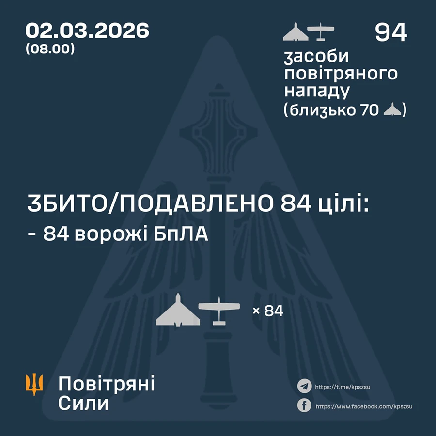С вечера 1 марта россияне атаковали Украину 94 ударными БПЛА типа Shahed, «Гербера», «Италмас» и беспилотниками других типов, 84 дрона удалось обезвредить, но есть и попадания.